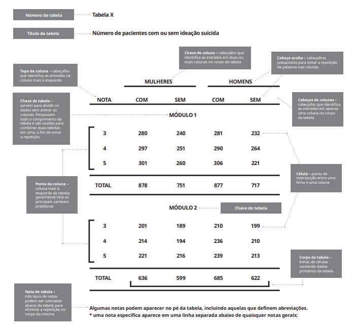 Exemplos de figuras e tabelas podem ser obtidos em manual da Faculdade de Saúde Pública da Universidade de São Paulo (FSP-USP). Outra sugestão de fonte é o Manual of the American Psychological Association.